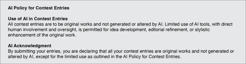 IMPORTANT: Please ensure that items are not behind a paywall or a password-protected area. If they are, you must provide username/password info in the Comments section of your entry. (Judges and contest officials will not create an account or download special software to access the content.) Judges may disqualify an entry without a refund if submissions are inaccessible.
